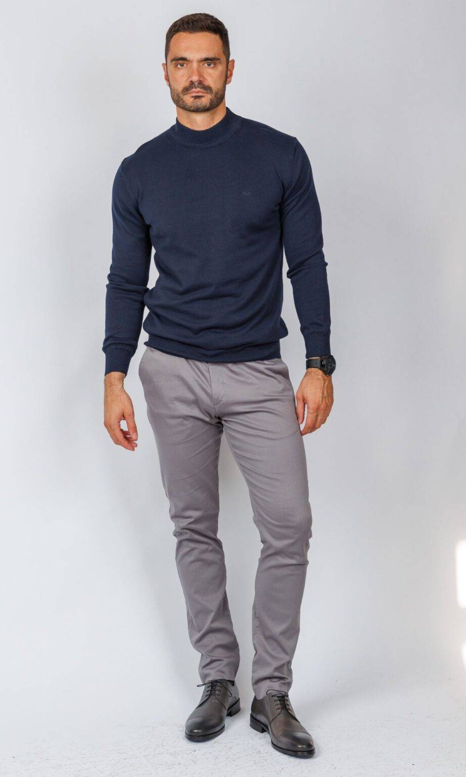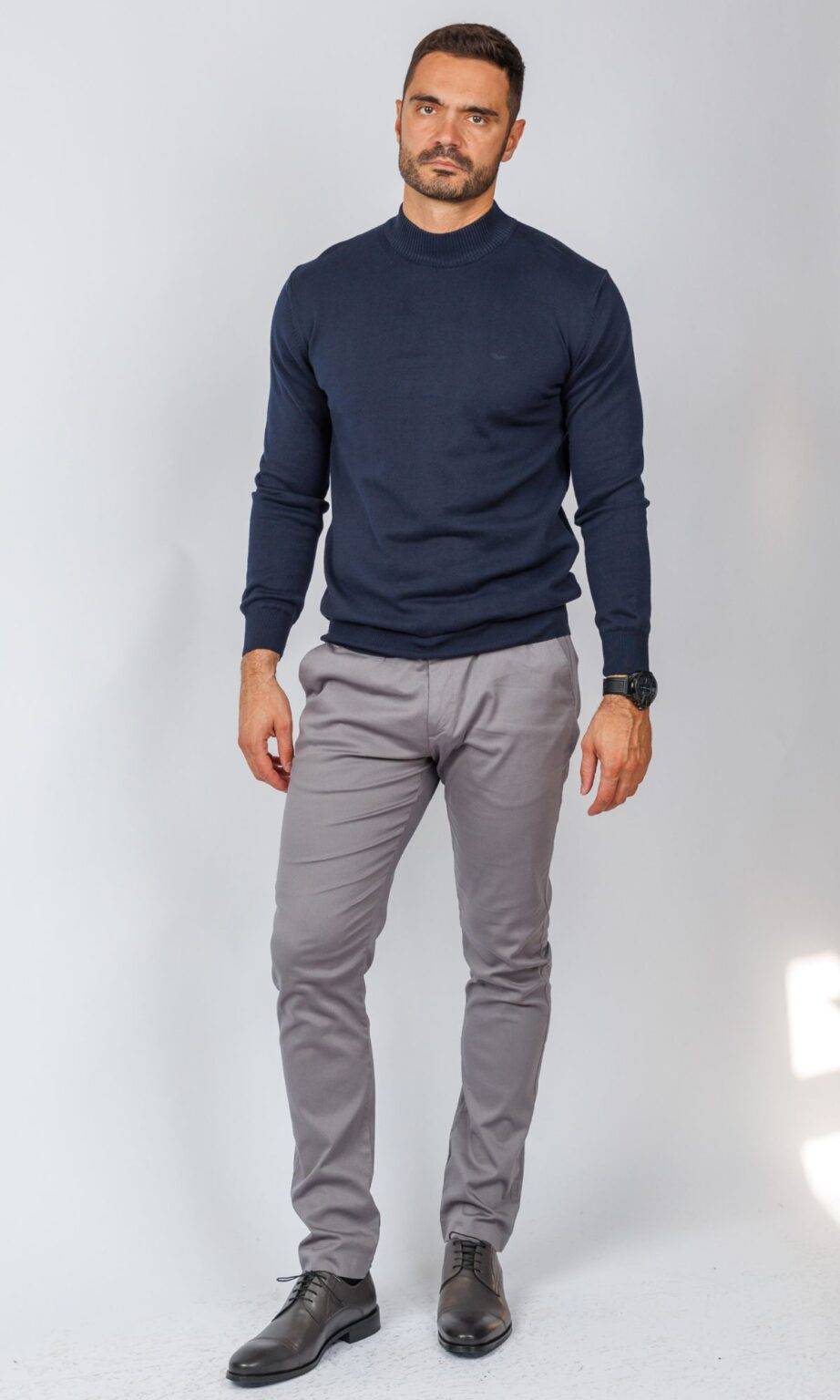 Muški džemper sa uspravnom, kratkom (polu) rol kragnom u klasičnoj teget boji. Izrađen od fine, glatke trikotaže sa diskretnim logotipom, idealan je za slojevite, doterane kežual kombinacije i deo je Atrium Fashion kolekcije.