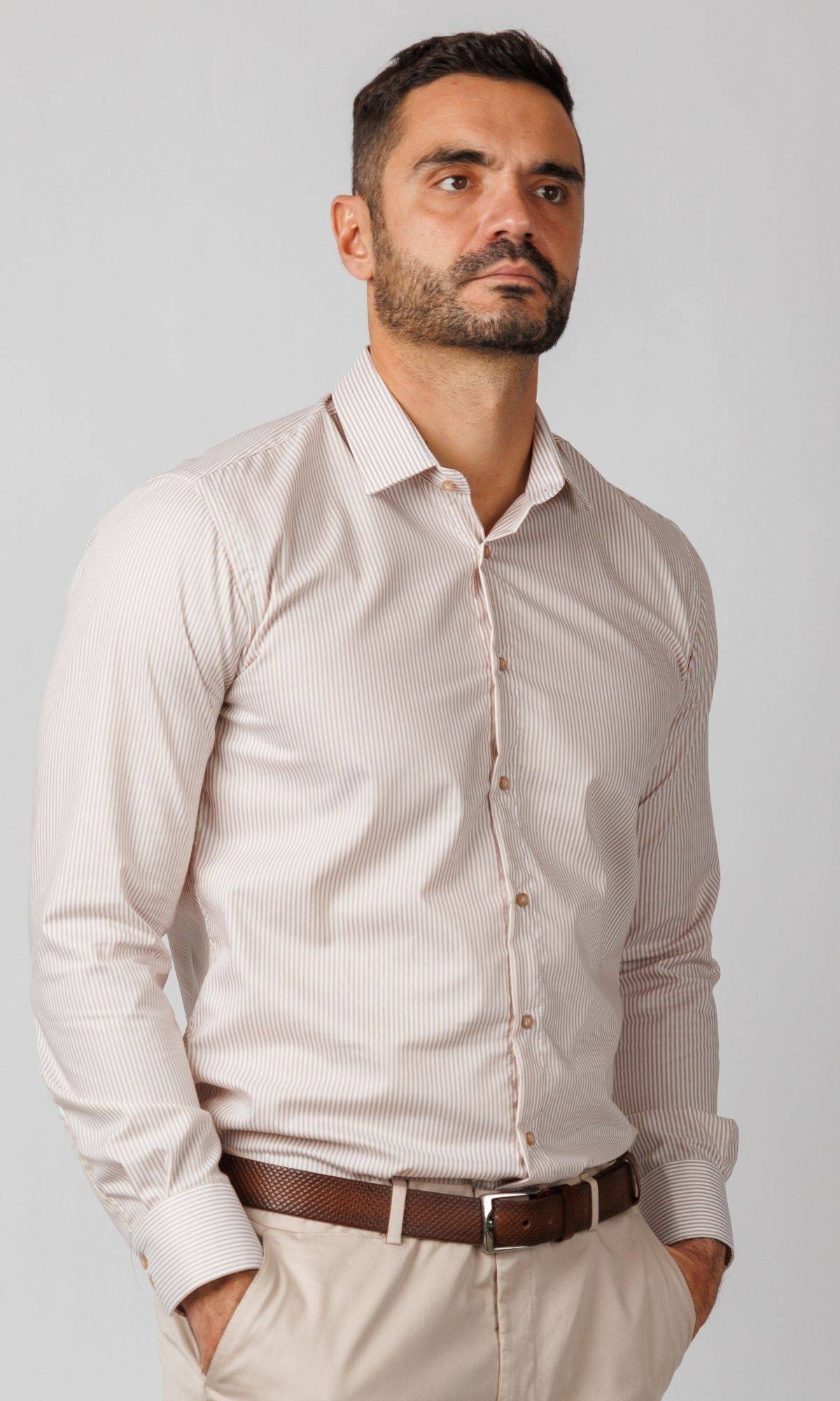 Prefinjena muška košulja iz ATRIUM FASHION kolekcije. Blago strukirani kroj i nežne bež prugice na krem osnovi čine je savršenom za smart-casual i poslovni stil. Idealna za kombinovanje sa zemljanim tonovima.