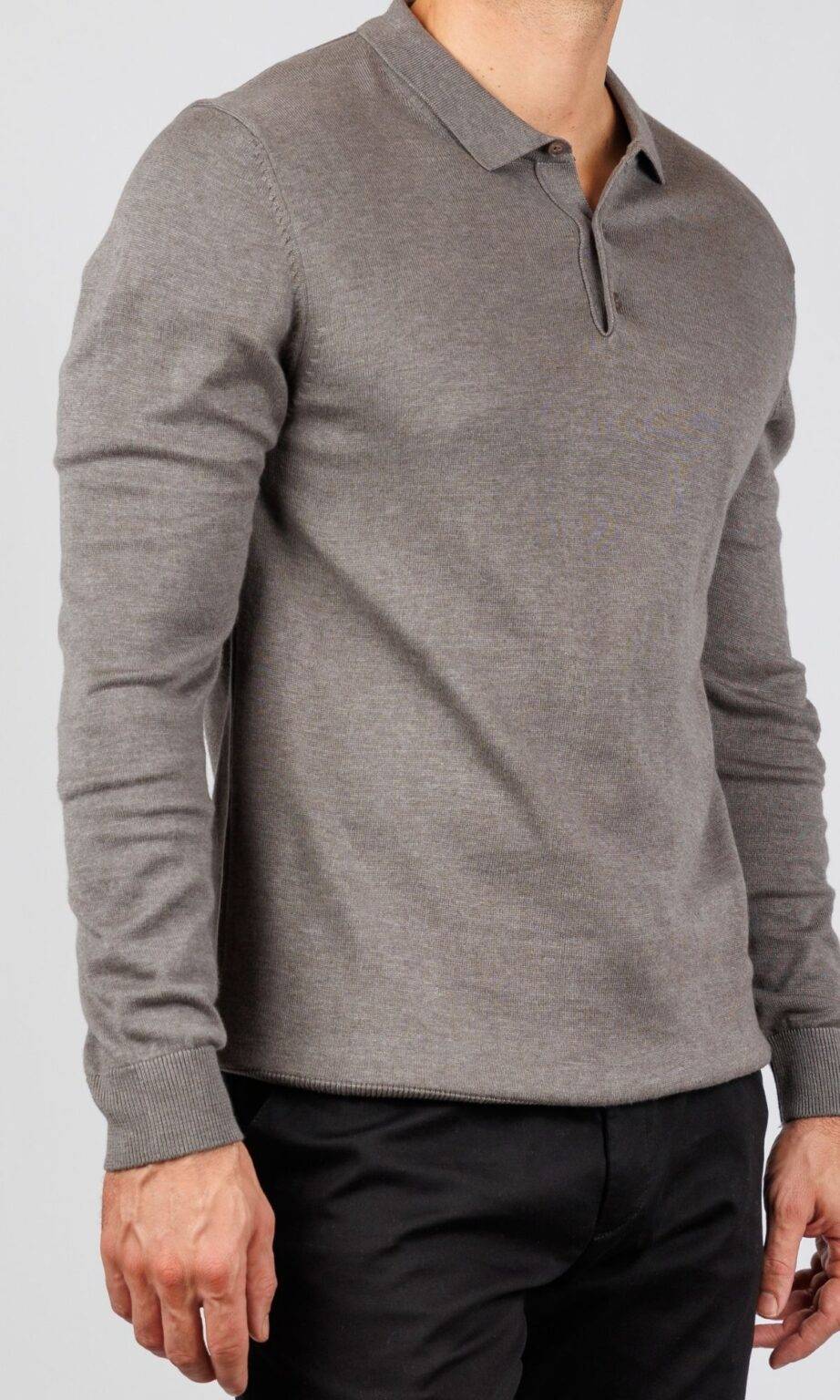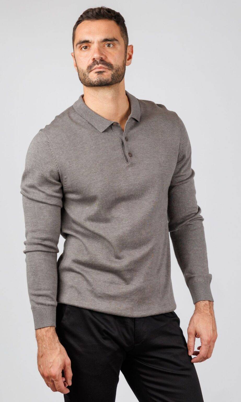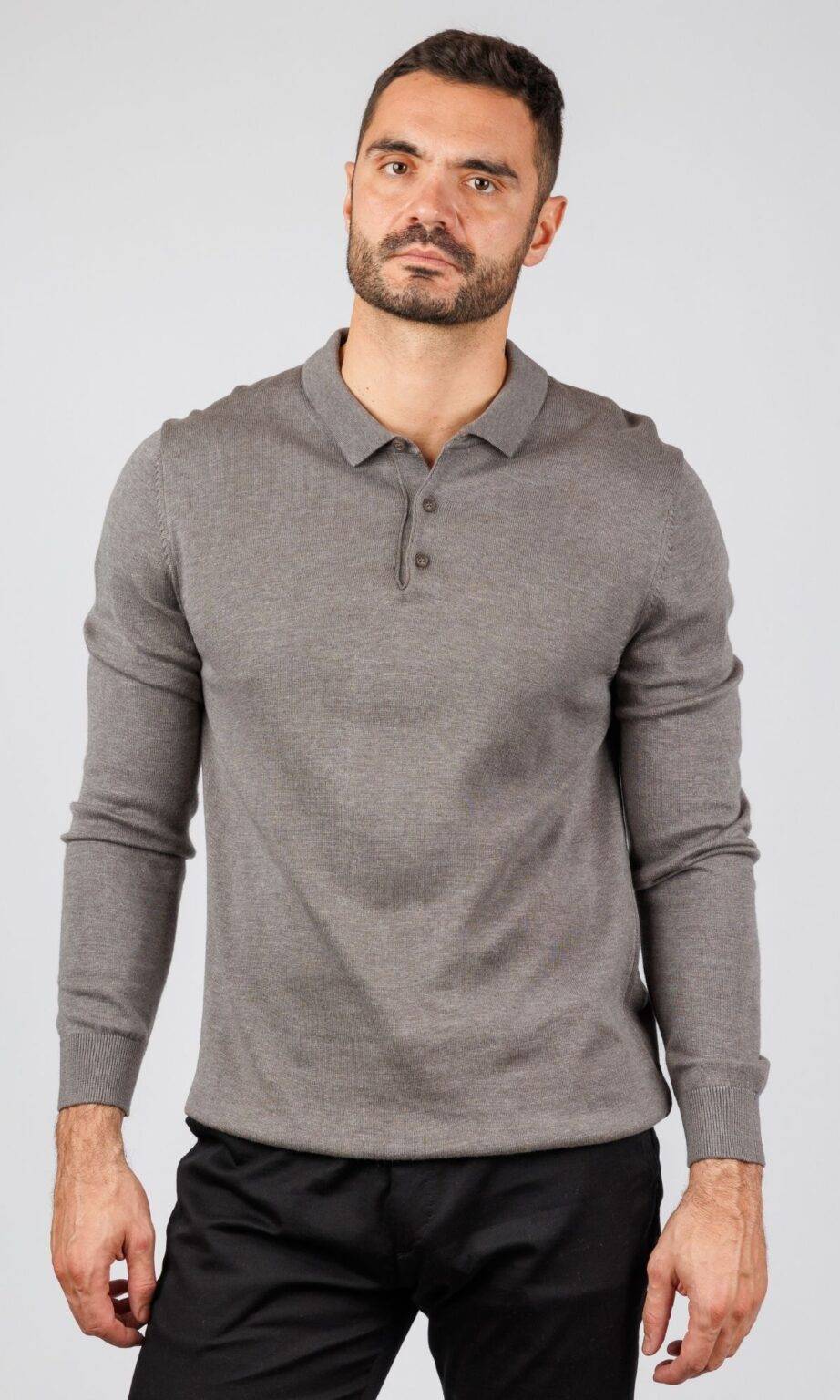 Muška pletena polo majica dugih rukava u elegantnoj srednje sivoj (braon-sivoj) nijansi. Sofisticirani kežual komad sa polo kragnom i diskretnim kopčanjem. Savršena osnova za prelazne i zimske kombinacije, deo modernog Atrium Fashion stila.