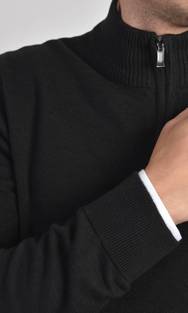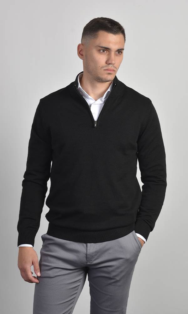 Muški džemper sa kratkim zipom (polu-zip/quarter-zip) u klasičnoj crnoj boji. Karakteriše ga rebrasta tekstura i uspravna kragna. Idealno rešenje za slojevito oblačenje preko košulje, esencijalni deo elegantne Atrium Fashion garderobe.