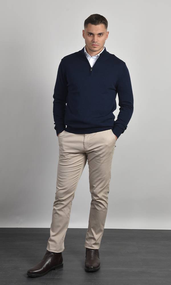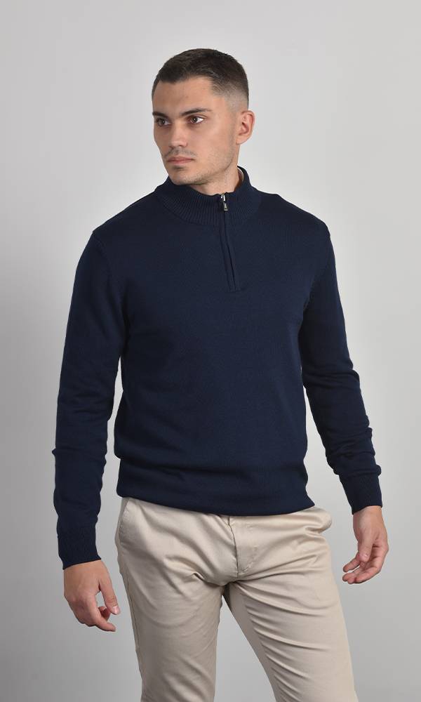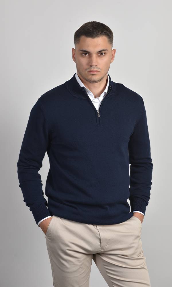 Muški džemper sa kratkim zipom (polu-zip/quarter-zip) u klasičnoj teget boji. Izrađen u suptilnoj rebrastoj teksturi sa uspravnom kragnom. Savršen za slojevito oblačenje preko košulje, esencijalni komad u ponudi Atrium Fashion.