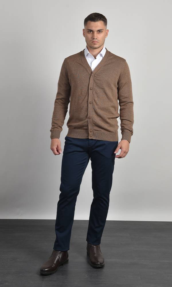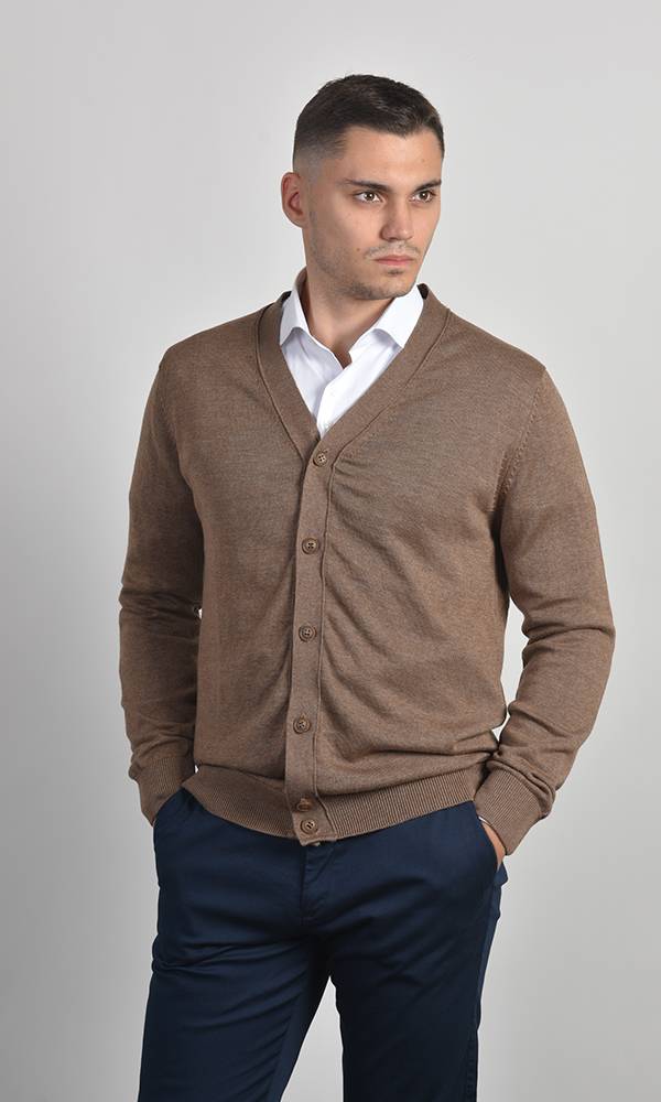 Muški džemper sa dugmadima u toploj srednje smeđoj boji sa V-izrezom i kopčanjem. Poseduje suptilnu teksturu pletiva. Nudi elegantnu, toplu alternativu tamnim bojama i savršeno se kombinuje sa teget pantalonama za smart-casual stil.