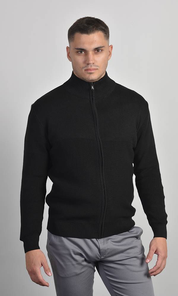 Muška džemper na puni zip u klasičnoj crnoj boji. Izrađena u rebrastom pletu, sa uspravnom kragnom i ranflama. Esencijalni komad za slojevito oblačenje koji pruža toplinu i strukturu, deo sofisticirane Atrium Fashion ponude.