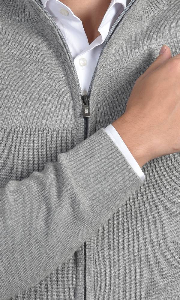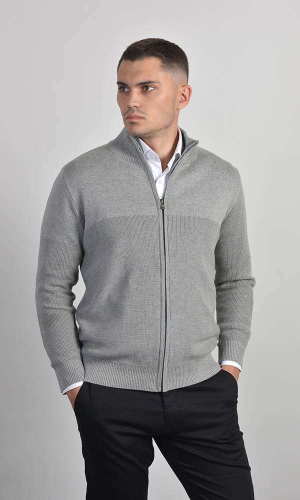 Muška džemper na puni zip u svetlosivoj boji. Odlikuje se kontrastnom pletenom teksturom na grudima i uspravnom kragnom, nudeći savršen spoj udobnosti i modernog stila, u duhu Atrium Fashion kolekcije.