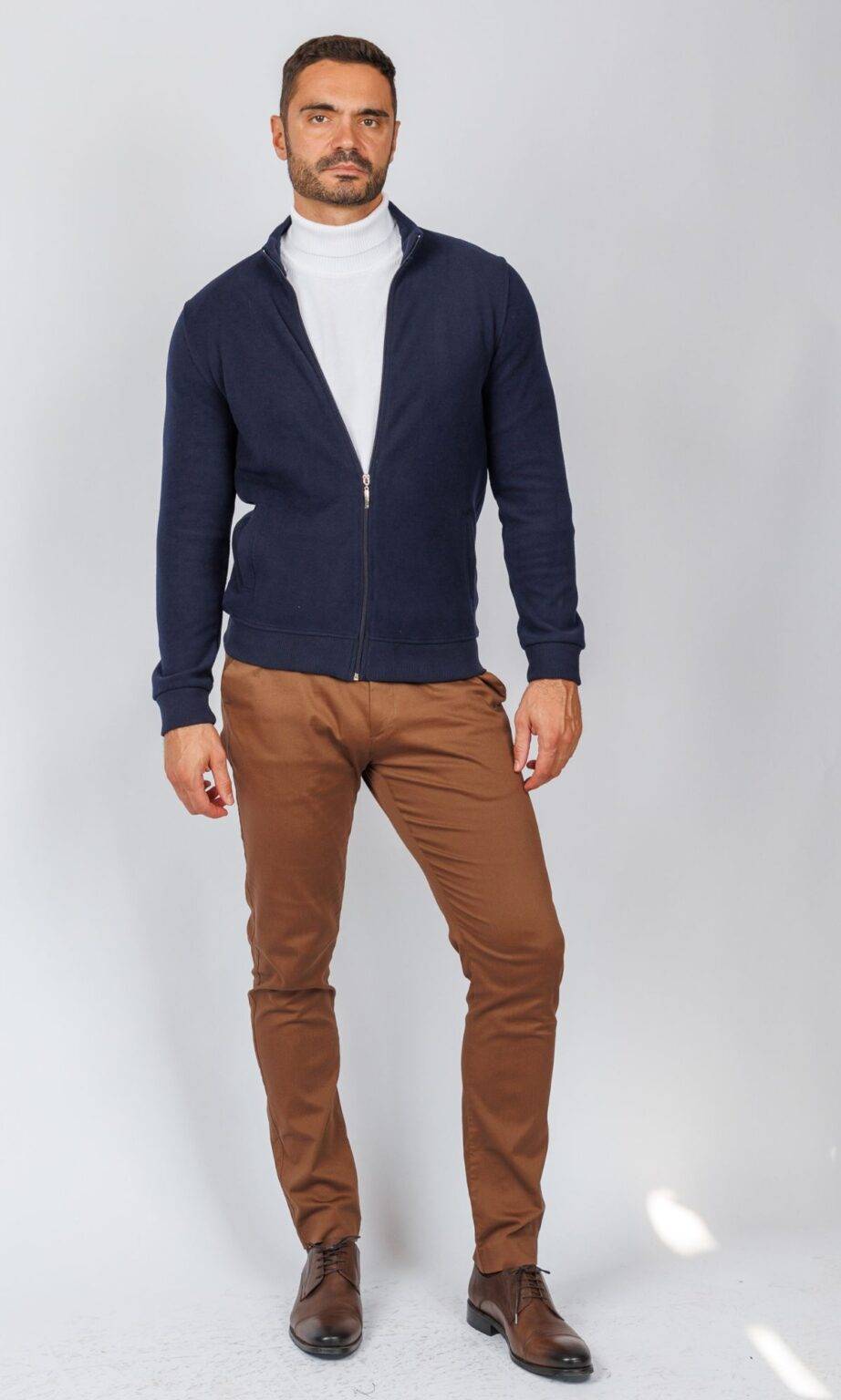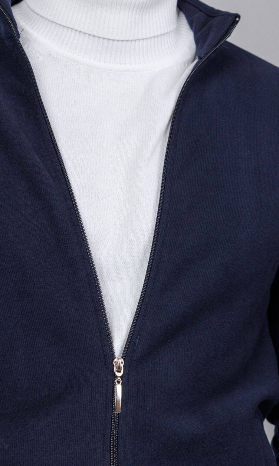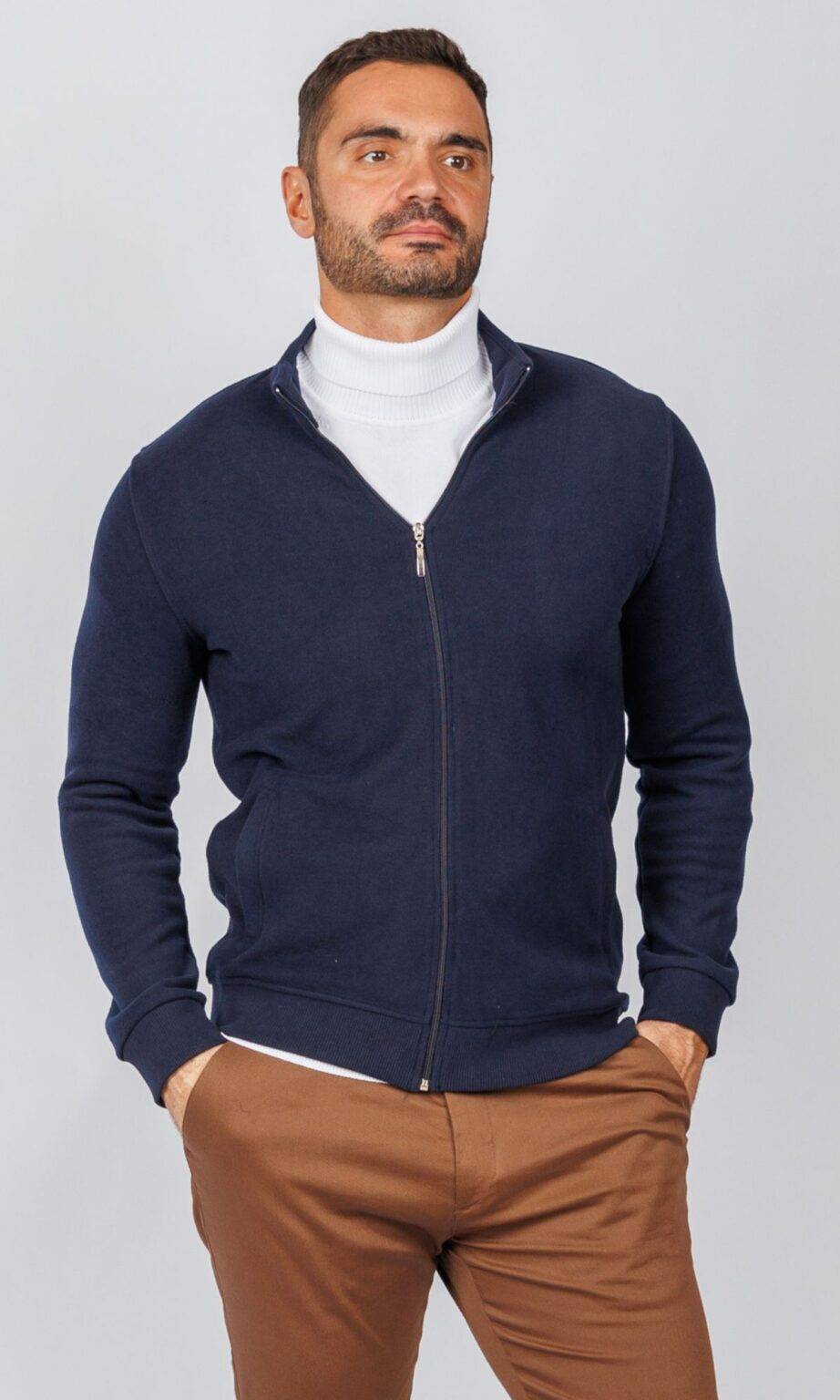 Muška dukserica/ džemper na puni zip u klasičnoj teget boji. Izrađena od udobnog, glatkog materijala (trikotaže/pamuka), sa uspravnom kragnom i ranflama. Savršena za slojevito oblačenje preko majice ili rolke, što je odlika praktičnog Atrium Fashion stila.