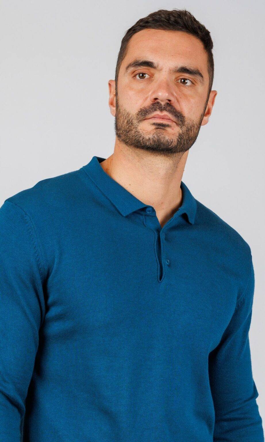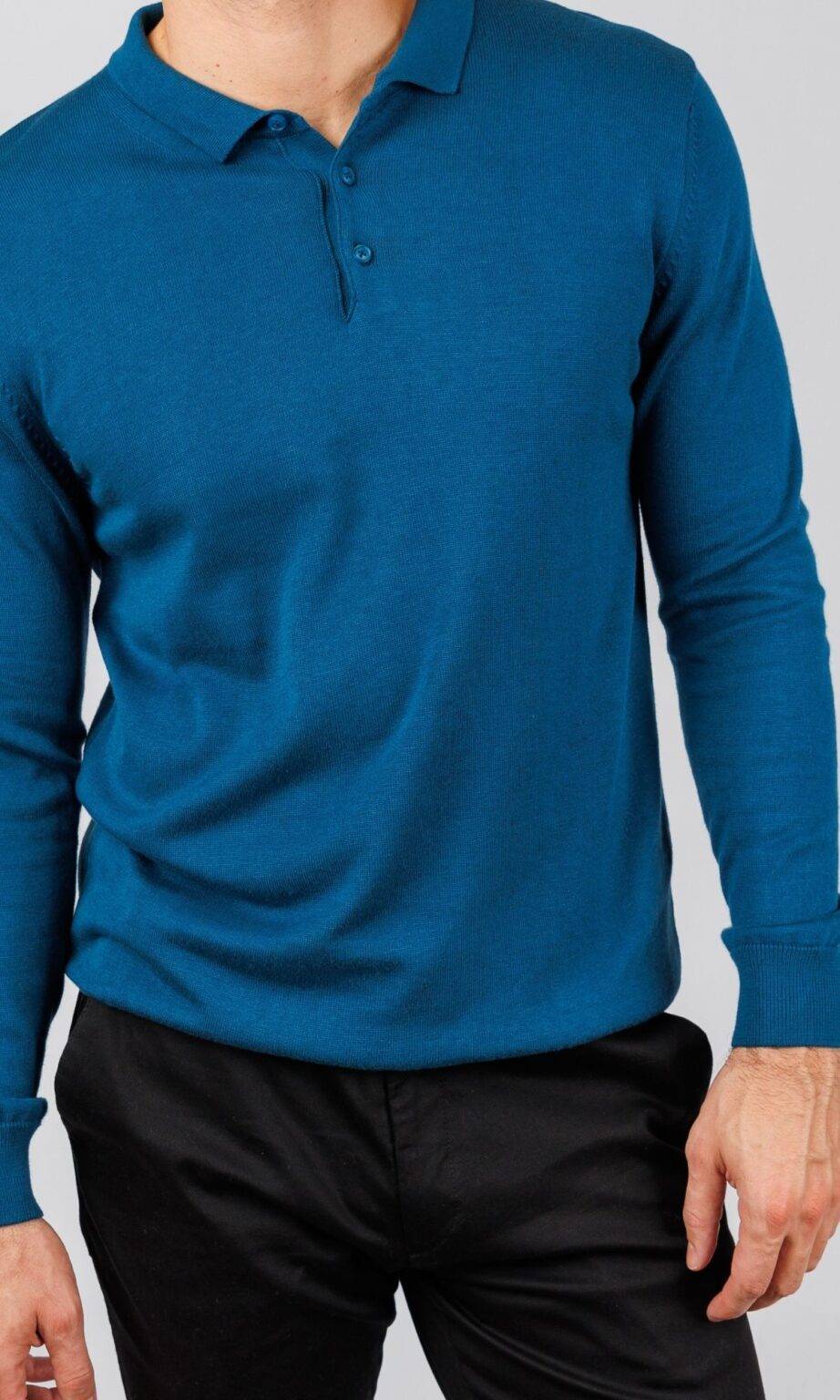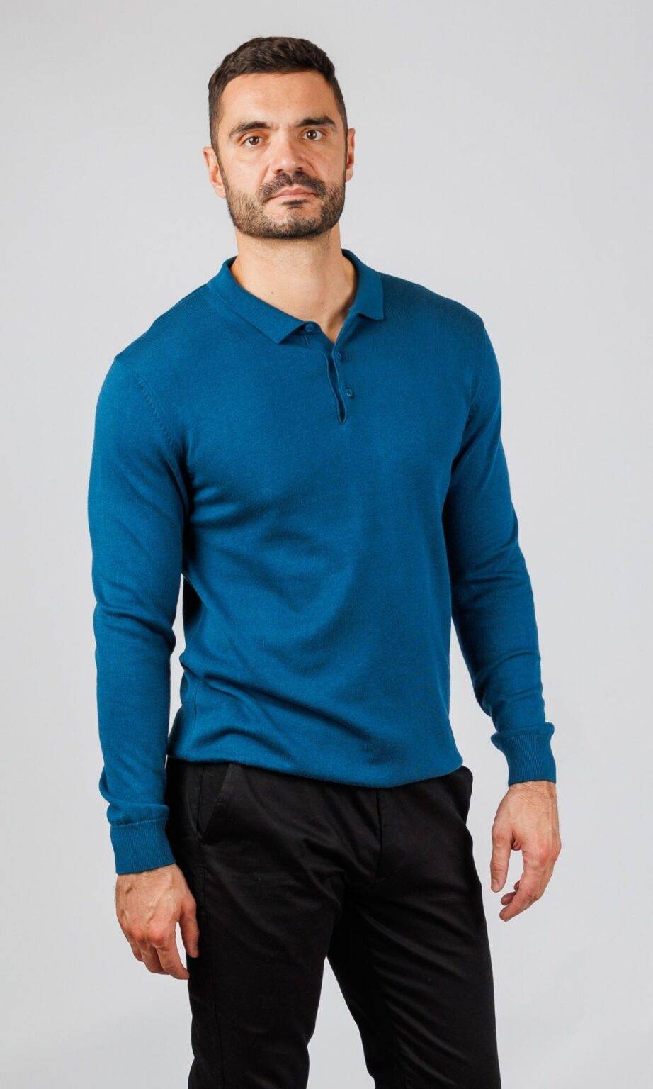 Muška pletena polo majica dugih rukava u upečatljivoj tirkizno plavoj (petrolej) boji. Pletena struktura, polo kragna i kopčanje na dugmiće čine je modernim i elegantnim komadom za svaku priliku, uz garanciju kvaliteta Atrium fashion.