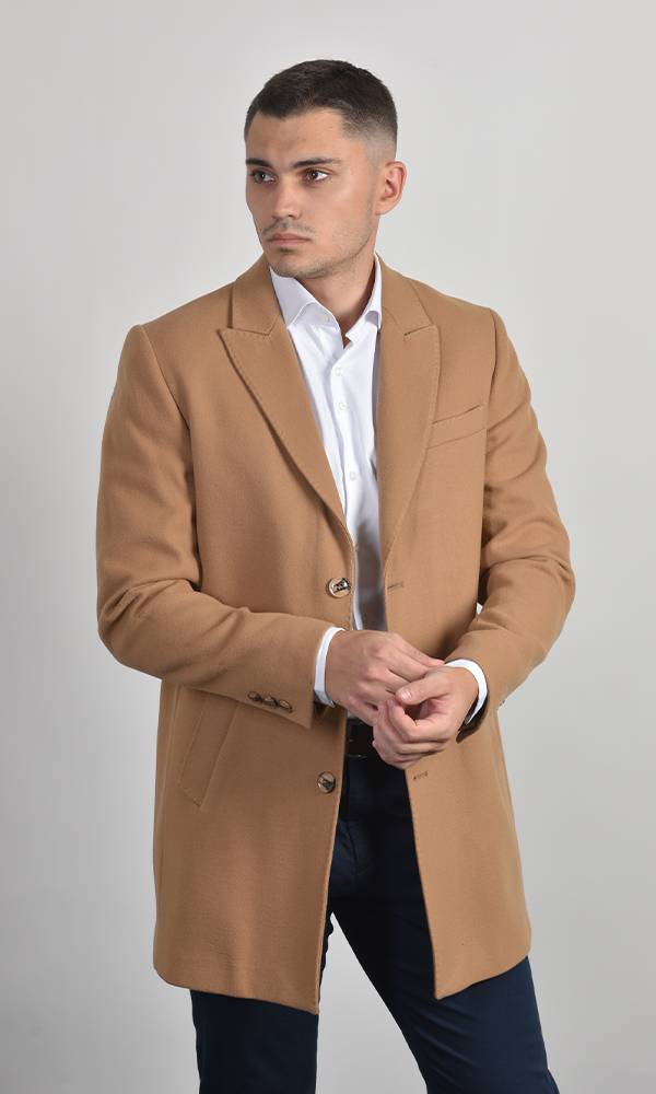 Muški kratki kaput u luksuznoj boji kamel/kamila. Klasičan kroj sa rever-kragnom i centralnim kopčanjem. Izrađen od vunene mešavine, idealan je za dodavanje svetlog akcenta i prefinjenosti zimskom stilu, deo premium Atrium Fashion kolekcije.