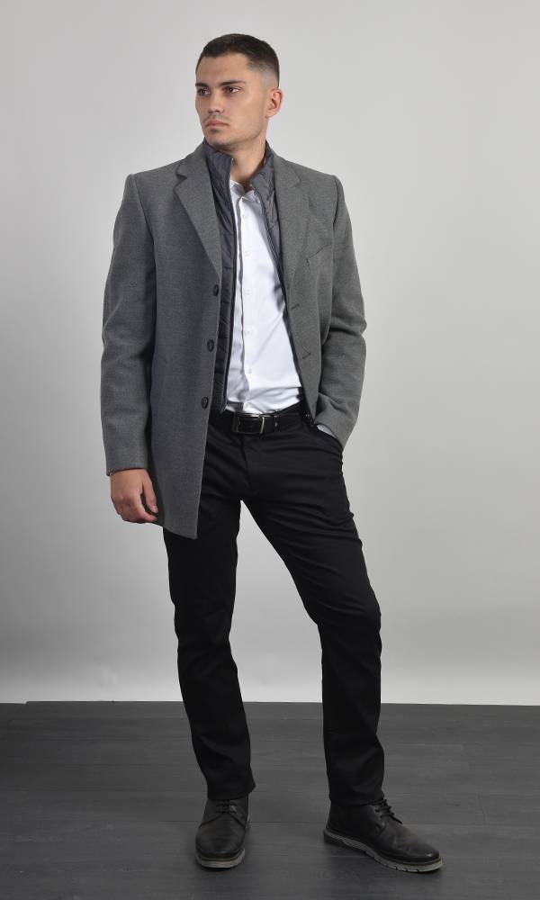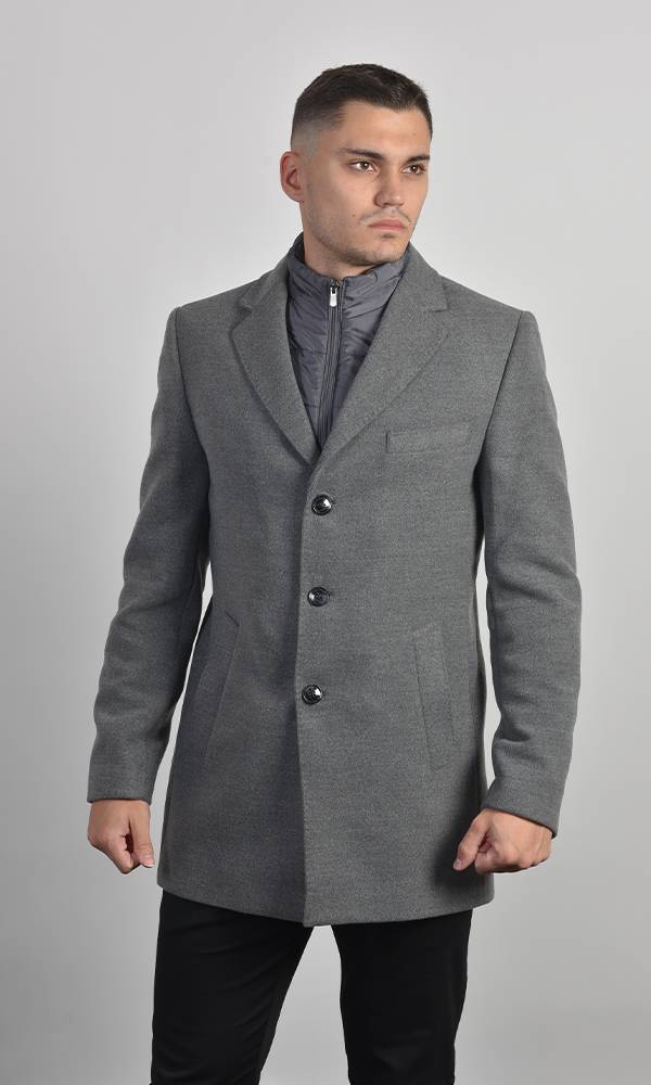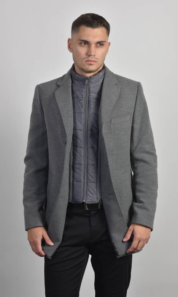 Muški kratki kaput u svetlo sivoj boji sa uklonjivim prošivenim umetkom na zip. Klasična rever-kragna sa centralnim kopčanjem. Savršen za slojevitu zimsku eleganciju, kombinujući toplinu i strukturu, deo Atrium Fashion ponude.