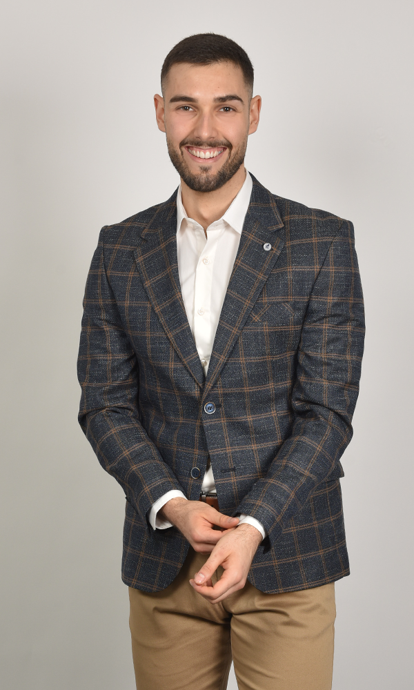 Ovaj upečatljivi tamno plavi sako sa braon karo dezenom (Windowpane Check) iz kolekcije ATRIUM FASHION donosi duboku teget boju obogaćenu klasičnim, jesenjim dezenom. Idealan je za sofisticirane smart-casual kombinacije, spajajući klasičnu eleganciju i moderni šarm.
