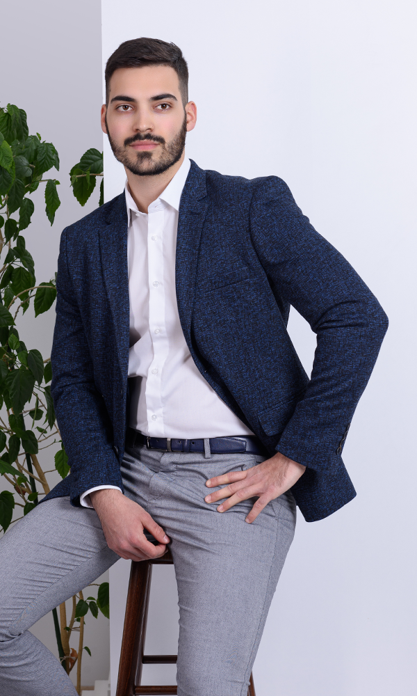 Ovaj Tamno Plavi Melirani Sako iz kolekcije ATRIUM FASHION donosi duboku teget boju obogaćenu izrazitom, finom teksturom (knitted efekat) sa svetlim plavim akcentima. Idealan je za smart-casual kombinacije, spajajući udobnost i prefinjeni stil.